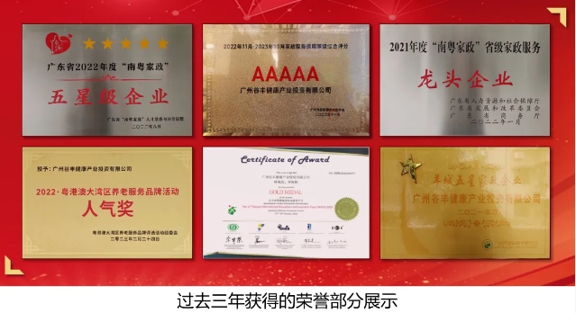 過(guò)去的三年是逆勢(shì)而上的三年,也是成果豐碩的三年。谷豐健康榮獲的省級(jí)及以上的榮譽(yù)多達(dá)21個(gè),市級(jí)榮譽(yù)10個(gè),區(qū)級(jí)榮譽(yù)8個(gè)等,合計(jì)39個(gè)。包括:2021年度“南粵家政”省級(jí)家政服務(wù)龍頭企業(yè)稱號(hào)、廣東省2022年度“南粵家政”五星級(jí)服務(wù)企業(yè)稱號(hào)、2023年廣州市家政服務(wù)綜合平臺(tái)信用等級(jí)5A企業(yè)稱號(hào)等。過(guò)去的成績(jī)凝聚著谷豐健康全體員工的心血和汗水,未來(lái)的機(jī)遇和挑戰(zhàn),需要我們繼續(xù)不懈努力地去面對(duì)。林總號(hào)召每一位谷豐人,2024年繼續(xù)聚合各業(yè)務(wù)板塊優(yōu)勢(shì),實(shí)現(xiàn)整體業(yè)績(jī)的突破!